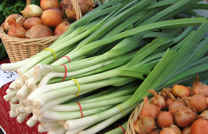 是大蒜幼苗发育到一定时期的青苗,它生长在农田里,它具有蒜的香辣味道,以其柔嫩的蒜叶和叶鞘供食用。蒜苗含有丰富的维生素C以及蛋白质、胡萝卜素、硫胺素、核黄素等营养成分。它的辣味主要来自其含有的辣素,这种辣素具有消积食的作用。